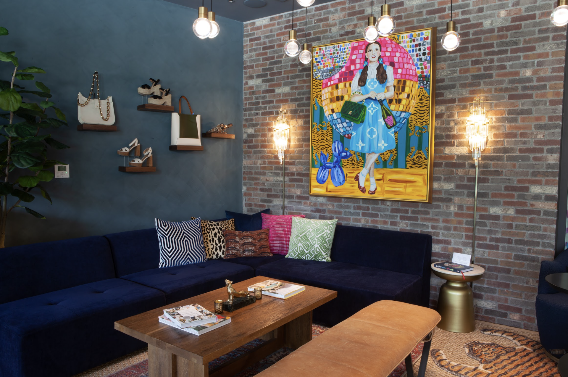 Our shoes are displayed on custom-made “shoe pods” that showcase both the style and all available sizes. This allows customers to explore and try on shoes at their own pace, without needing to ask for assistance. The idea is to grab a glass of wine and try on as many pairs as you like. Anchoring our lounge is a commissioned piece of artwork by Ashley Longshore, featuring Dorothy from The Wizard of Oz, complete with ruby red slippers and a bottle of champagne. It’s playful, glamorous and perfectly captures the spirit of Blue Suede.